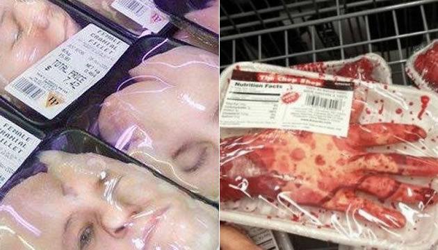 Um supermercado na Noruega resolveu fazer uma pegadinha de Halloween. A Europis no lugar de carnes de animais, colocou pedaços falsos de corpo humano.